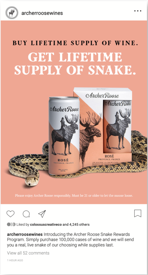 Archer Roose, known for its adventurous approach to wine, sought to disrupt traditional, often pretentious, wine marketing. To achieve this, we launched the audacious "Snake Rewards Program," a campaign that humorously parodied conventional customer loyalty initiatives. In collaboration with Elizabeth Banks, we introduced a fictional rewards program offering a live snake to customers who purchased 100,000 cases of Archer Roose wine.